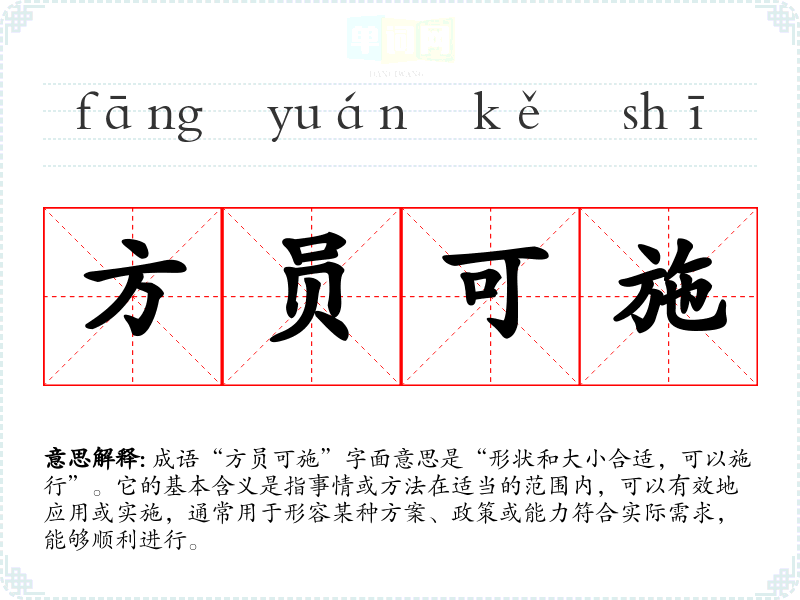 成语“方员可施”字面意思是“形状和大小合适,可以施行”。它的基本含义是指事情或方法在适当的范围内,可以有效地应用或实施,通常用于形容某种方案、政策或能力符合实际需求,能够顺利进行。