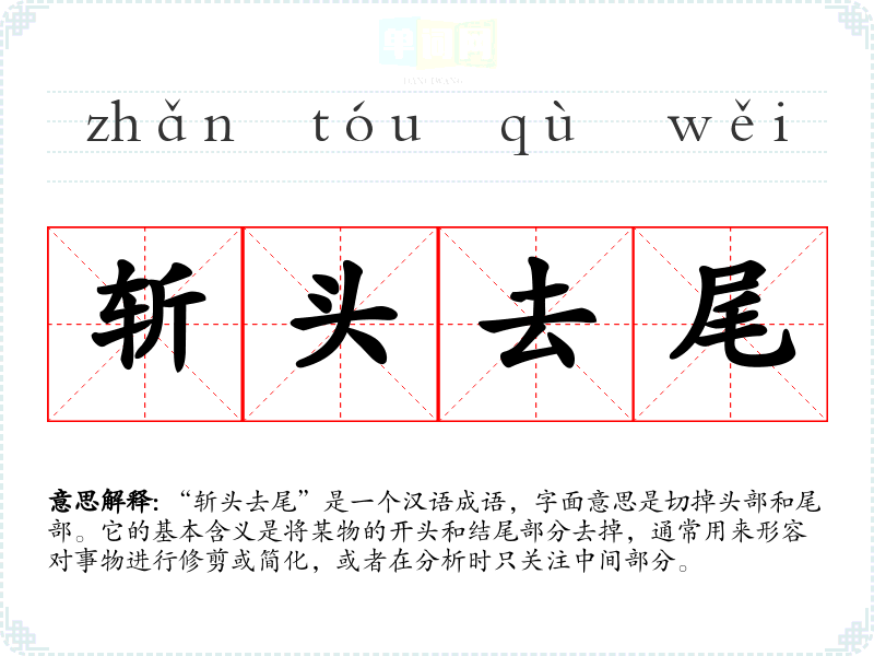 | 斩头去尾 | 斩掉头部,除去尾部。指将整体分割。也指剩下中间部分。 |