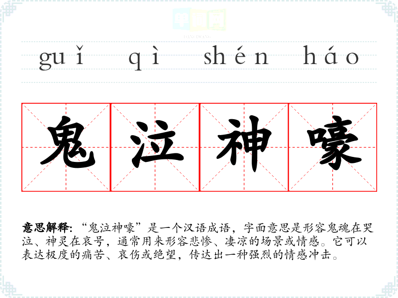 “鬼泣神嚎”是一个汉语成语,字面意思是形容鬼魂在哭泣、神灵在哀号,通常用来形容悲惨、凄凉的场景或情感。它可以表达极度的痛苦、哀伤或绝望,传达出一种强烈的情感冲击。