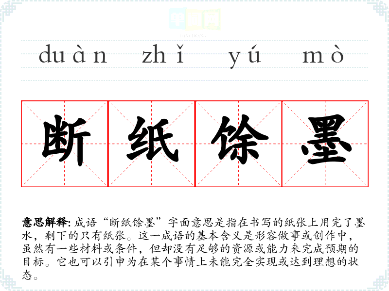 成语“断纸馀墨”字面意思是指在书写的纸张上用完了墨水,剩下的只有纸张。这一成语的基本含义是形容做事或创作中,虽然有一些材料或条件,但却没有足够的资源或能力来完成预期的目标。它也可以引申为在某个事情上未能完全实现或达到理想的状态。