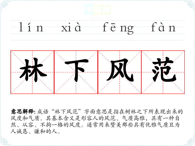成语“林下风范”字面意思是指在树林之下所表现出来的风度和气质。其基本含义是形容人的风范、气质高雅,具有一种自然、从容、不拘一格的风度。通常用来赞美那些具有优雅气质且为人诚恳、谦和的人。