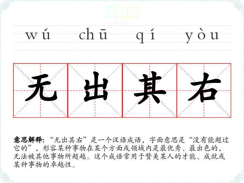 “无出其右”是一个汉语成语,字面意思是“没有能超过它的”,形容某种事物在某个方面或领域内是最优秀、最出色的,无法被其他事物所超越。这个成语常用于赞美某人的才能、成就或某种事物的卓越性。