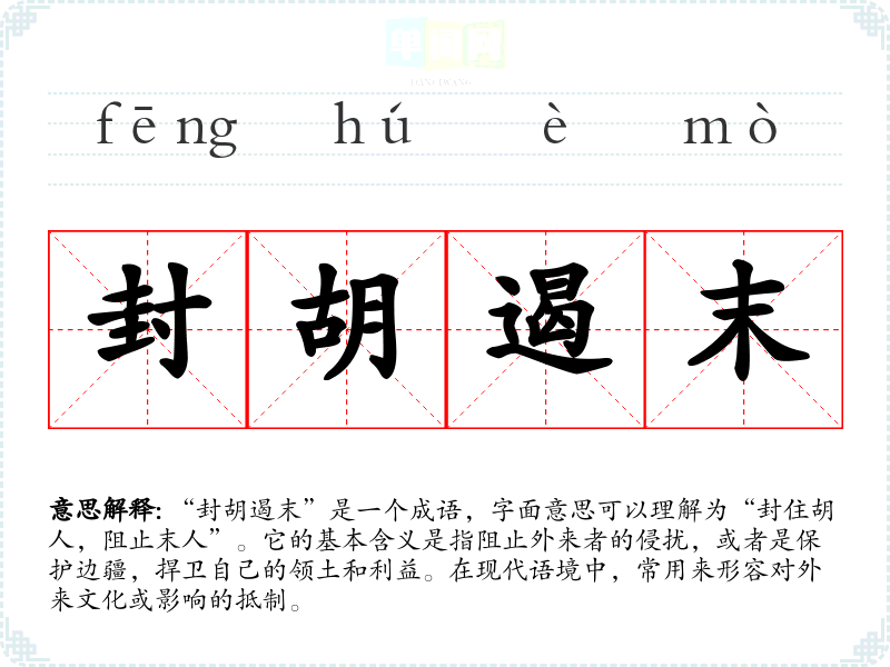“封胡遏末”是一个成语,字面意思可以理解为“封住胡人,阻止末人”。它的基本含义是指阻止外来者的侵扰,或者是保护边疆,捍卫自己的领土和利益。在现代语境中,常用来形容对外来文化或影响的抵制。