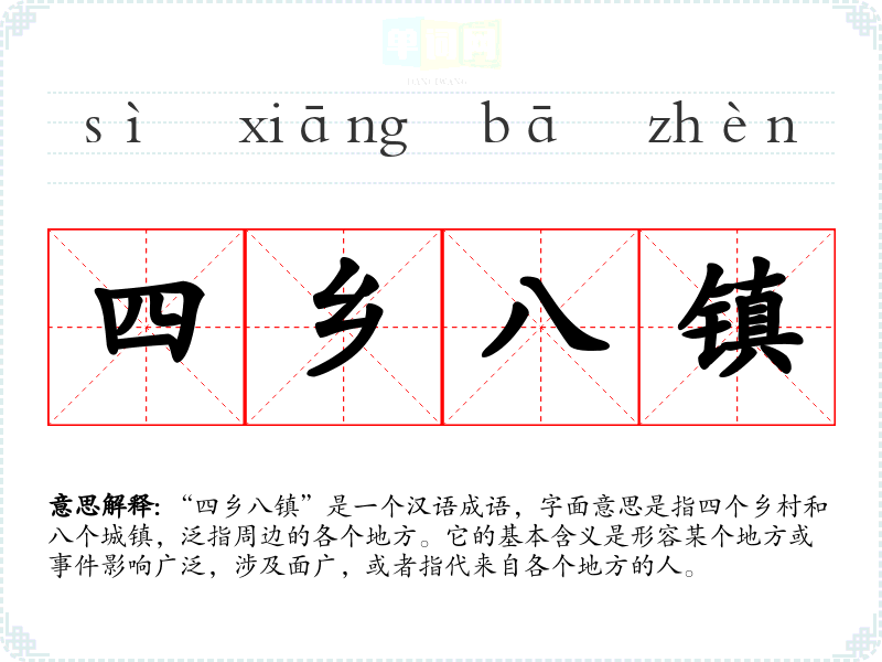 “四乡八镇”是一个汉语成语,字面意思是指四个乡村和八个城镇,泛指周边的各个地方。它的基本含义是形容某个地方或**影响广泛,涉及面广,或者指代来自各个地方的人。