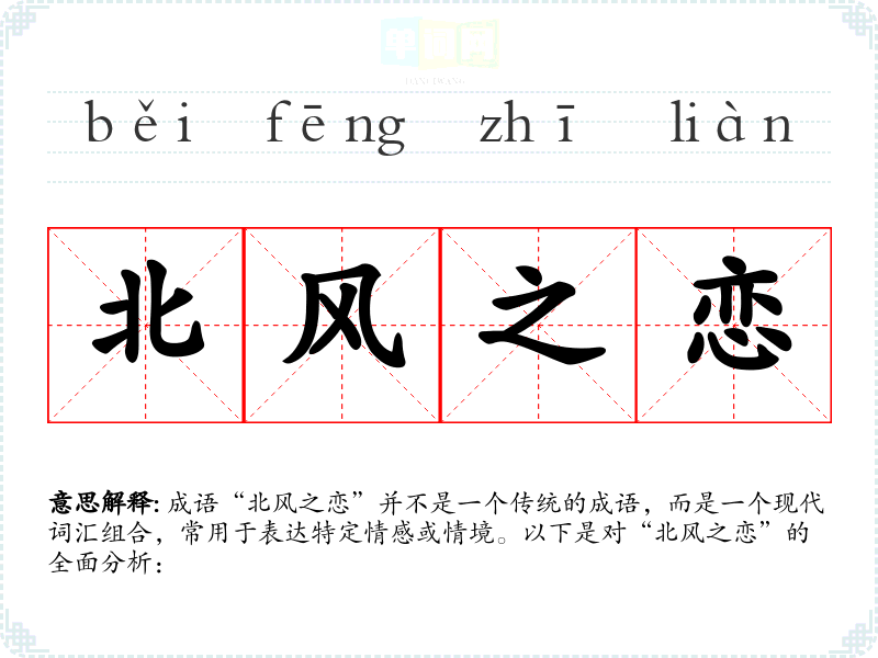 成语“北风之恋”并不是一个传统的成语,而是一个现代词汇组合,常用于表达特定情感或情境。以下是对“北风之恋”的全面分析: