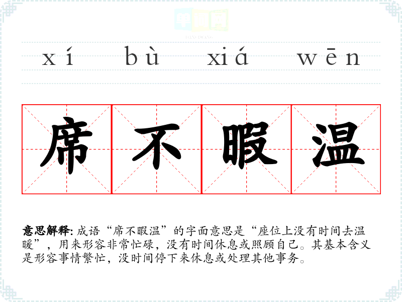 成语“席不暇温”的字面意思是“座位上没有时间去温暖”,用来形容非常忙碌,没有时间休息或照顾自己。其基本含义是形容事情繁忙,没时间停下来休息或处理其他事务。