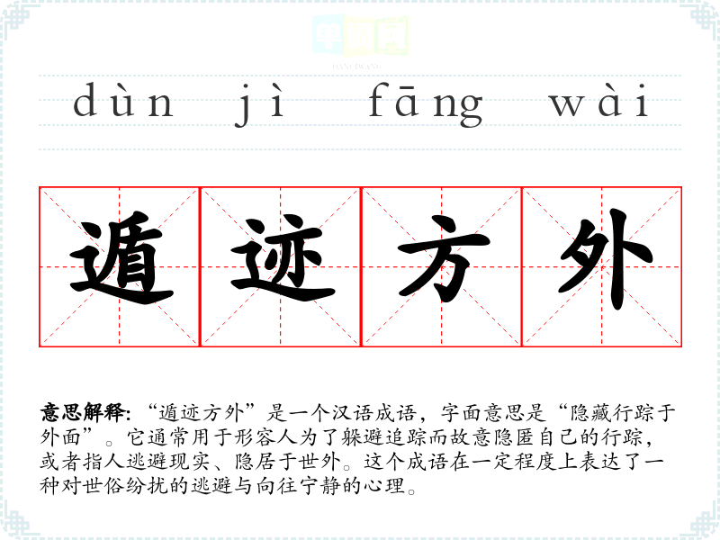 “遁迹方外”是一个汉语成语,字面意思是“隐藏行踪于外面”。它通常用于形容人为了躲避追踪而故意隐匿自己的行踪,或者指人逃避现实、隐居于世外。这个成语在一定程度上表达了一种对世俗纷扰的逃避与向往宁静的心理。