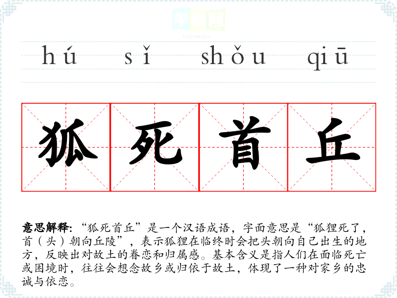“狐死首丘”是一个汉语成语,字面意思是“狐狸死了,首(头)朝向丘陵”,表示狐狸在临终时会把头朝向自己出生的地方,反映出对故土的眷恋和归属感。基本含义是指人们在面临死亡或困境时,往往会想念故乡或归依于故土,体现了一种对家乡的忠诚与依恋。