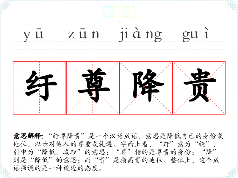 “纡尊降贵”是一个汉语成语,意思是降低自己的身份或地位,以示对他人的尊重或礼遇。字面上看,“纡”意为“绕”,引申为“降低、减轻”的意思;“尊”指的是尊贵的身份;“降”则是“降低”的意思;而“贵”是指高贵的地位。整体上,这个成语强调的是一种谦逊的态度。