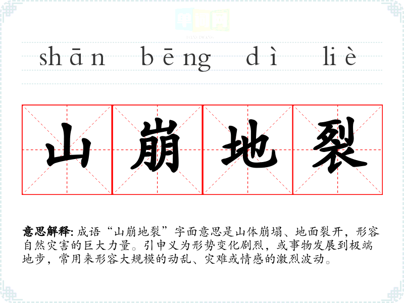 成语“山崩地裂”字面意思是山体崩塌、地面裂开,形容自然灾害的巨大力量。引申义为形势变化剧烈,或事物发展到极端地步,常用来形容***的动乱、灾难或情感的激烈波动。
