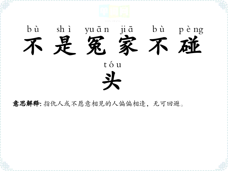 | 不是冤家不碰头 | 指仇人或不愿意相见的人偏偏相逢,无可回避。 |