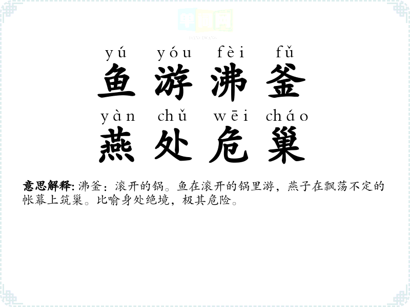 | 幕燕釜鱼 | 比喻处境极危,即将覆灭。同“幕燕鼎鱼”。 |