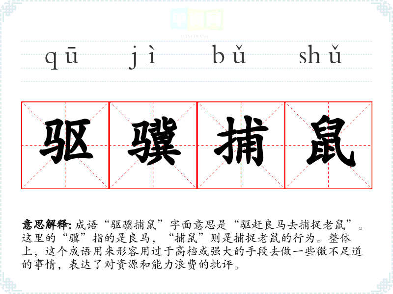 成语“驱骥捕鼠”字面意思是“驱赶良马去捕捉老鼠”。这里的“骥”指的是良马,“捕鼠”则是捕捉老鼠的行为。整体上,这个成语用来形容用过于高档或强大的手段去做一些微不足道的事情,表达了对资源和能力浪费的批评。