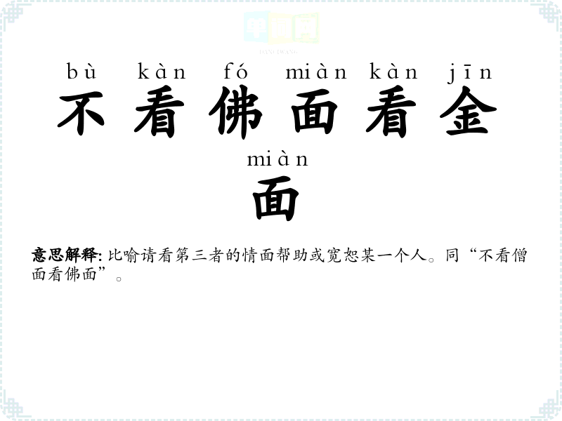 | 不看佛面看金面 | 比喻请看第三者的情面帮助或宽恕某一个人。同“不看僧面看佛面”。 |