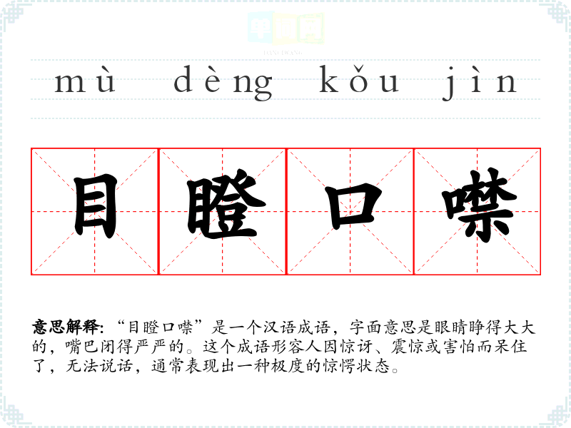 | 目瞪口噤 | 目瞪:睁大眼睛直视;口噤:嘴里说不出话来。形容因吃惊或害怕而发愣的样子。 |