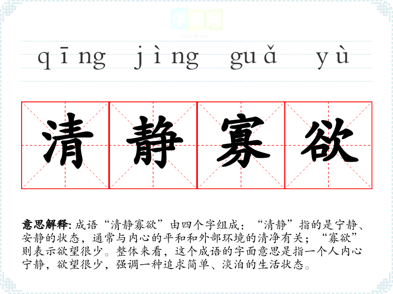 成语“清静寡欲”由四个字组成:“清静”指的是宁静、安静的状态,通常与内心的平和和外部环境的清净有关;“寡欲”则表示欲望很少。整体来看,这个成语的字面意思是指一个人内心宁静,欲望很少,强调一种追求简单、淡泊的生活状态。