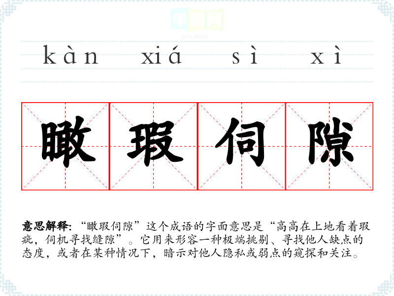 “瞰瑕伺隙”这个成语的字面意思是“高高在上地看着瑕疵,伺机寻找缝隙”。它用来形容一种极端挑剔、寻找他人缺点的态度,或者在某种情况下,暗示对他人隐私或弱点的窥探和关注。