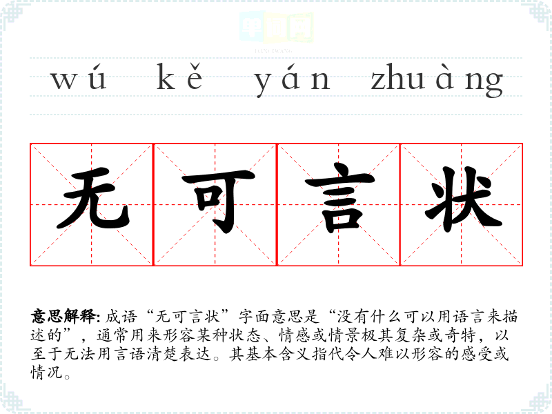 成语“无可言状”字面意思是“没有什么可以用语言来描述的”,通常用来形容某种状态、情感或情景极其复杂或奇特,以至于无法用言语清楚表达。其基本含义指代令人难以形容的感受或情况。