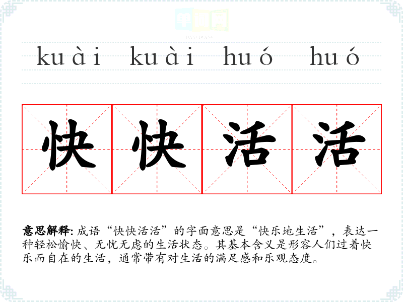 成语“快快活活”的字面意思是“快乐地生活”,表达一种轻松愉快、无忧无虑的生活状态。其基本含义是形容人们过着快乐而自在的生活,通常带有对生活的满足感和乐观态度。