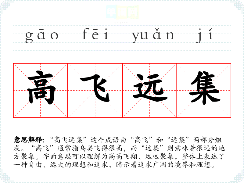 “高飞远集”这个成语由“高飞”和“远集”两部分组成。“高飞”通常指鸟类飞得很高,而“远集”则意味着很远的地方聚集。字面意思可以理解为高高飞翔、远远聚集,整体上表达了一种自由、远大的理想和追求,暗示着追求广阔的境界和理想。