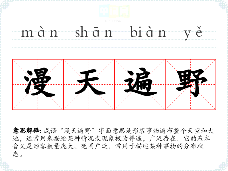 - 演讲:用于强调某种现象的普遍性,如“我们的社区志愿者活动,参与者漫天遍野”。