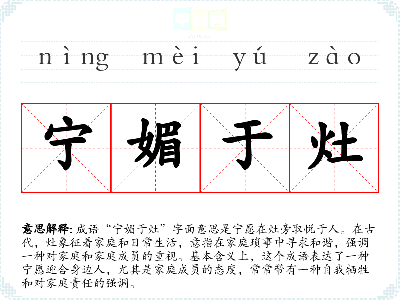 成语“宁媚于灶”字面意思是宁愿在灶旁取悦于人。在古代,灶象征着家庭和日常生活,意指在家庭琐事中寻求和谐,强调一种对家庭和家庭成员的重视。基本含义上,这个成语表达了一种宁愿迎合身边人,尤其是家庭成员的态度,常常带有一种自我牺牲和对家庭责任的强调。