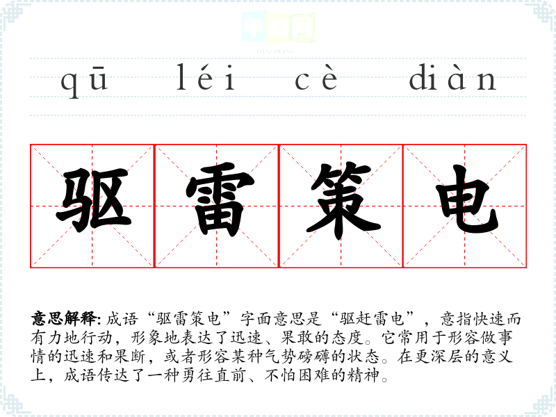 通过对“驱雷策电”的学,我更加理解了在生活和工作中,决策和行动的重要性。这个成语不仅丰富了我的词汇,也让我在面对困难时更加自信,能够更好地表达自己的思想和情感。在语言学中,认识和运用这样的成语,能够增强我的表达能力,使交流更加生动有力。