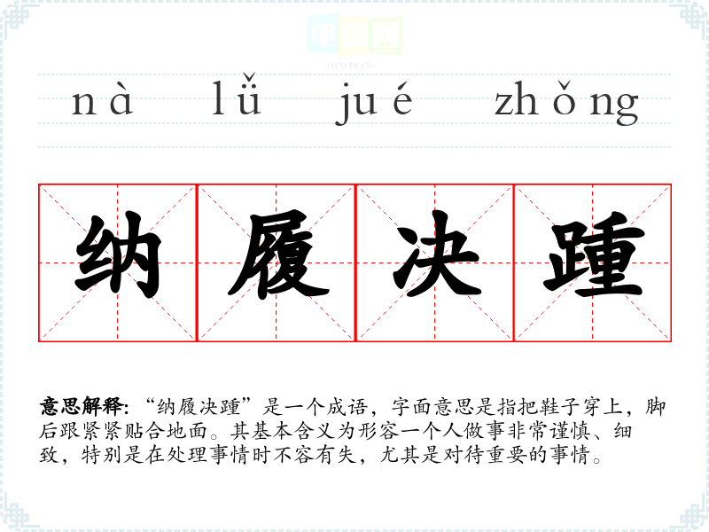 “纳履决踵”是一个成语,字面意思是指把鞋子穿上,脚后跟紧紧贴合地面。其基本含义为形容一个人做事非常谨慎、细致,特别是在处理事情时不容有失,尤其是对待重要的事情。