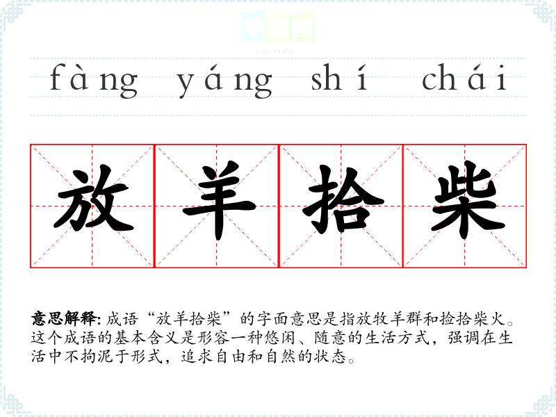 成语“放羊拾柴”的字面意思是指放牧羊群和捡拾柴火。这个成语的基本含义是形容一种悠闲、随意的生活方式,强调在生活中不拘泥于形式,追求自由和自然的状态。