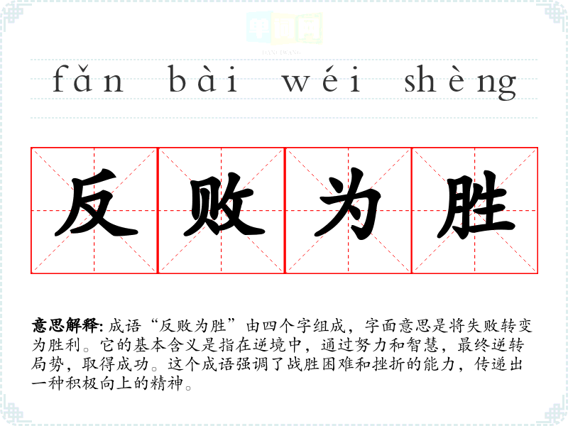 成语“反败为胜”由四个字组成,字面意思是将失败转变为胜利。它的基本含义是指在逆境中,通过努力和智慧,最终逆转局势,取得成功。这个成语强调了战胜困难和挫折的能力,传递出一种积极向上的精神。