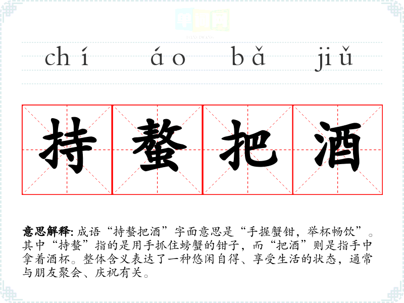“持螯把酒”这一成语源自于**古代文人雅士的饮酒文化,尤其是与海鲜、蟹类相关的宴饮场合。在古代诗文中,常常描绘诗人与友人对饮、共享美食的场景,表现出一种洒脱与豁达的精神。具体的文学出处可能难以考证,但这种饮酒文化在唐宋时期尤为流行,留下了大量相关的诗词作品。