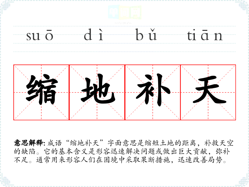 成语“缩地补天”字面意思是缩短土地的距离,补救天空的缺陷。它的基本含义是形容迅速解决问题或做出巨大贡献,弥补不足。通常用来形容人们在困境中采取果断措施,迅速改善局势。
