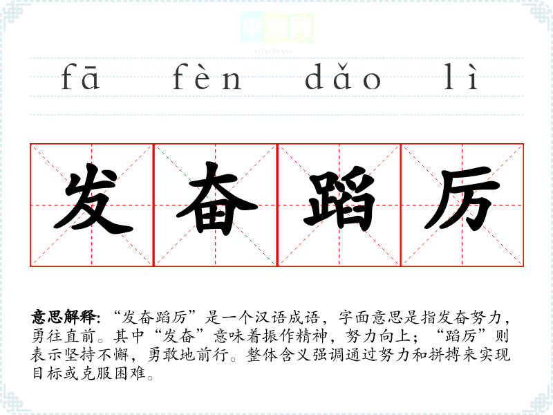“发奋蹈厉”是一个汉语成语,字面意思是指发奋努力,勇往直前。其中“发奋”意味着振作精神,努力向上;“蹈厉”则表示坚持不懈,勇敢地前行。整体含义强调通过努力和拼搏来实现目标或克服困难。