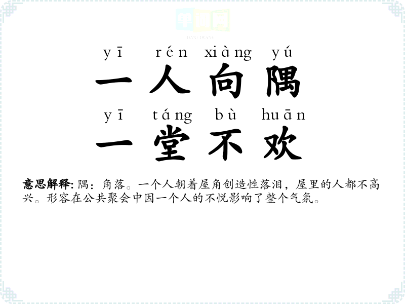 | 一人向隅,一堂不欢 | 隅:角落。一个人朝着屋角创造性落泪,屋里的人都不高兴。形容在公共聚会中因一个人的不悦影响了整个气氛。 |