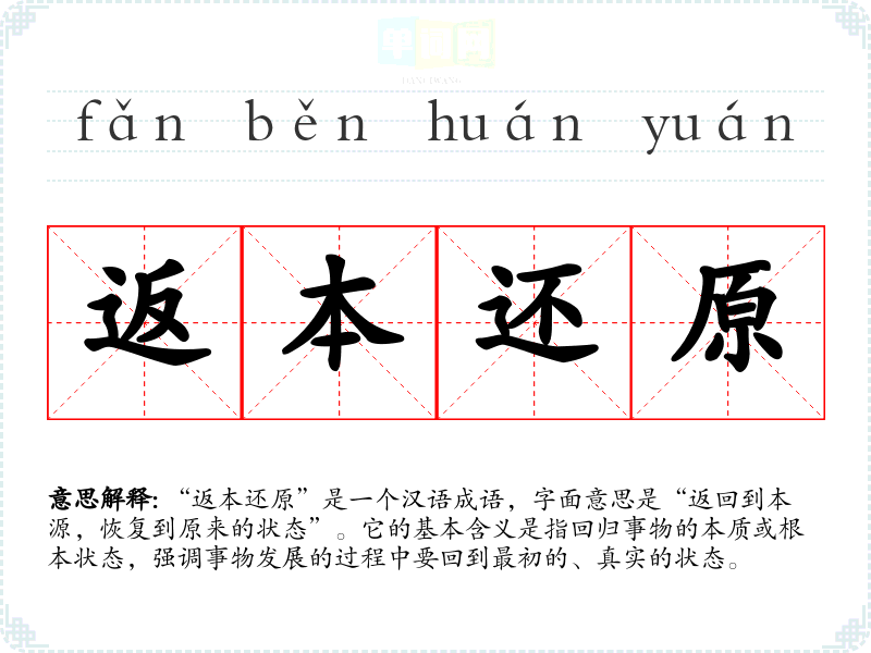 “返本还原”是一个汉语成语,字面意思是“返回到本源,恢复到原来的状态”。它的基本含义是指回归事物的本质或根本状态,强调事物发展的过程中要回到最初的、真实的状态。