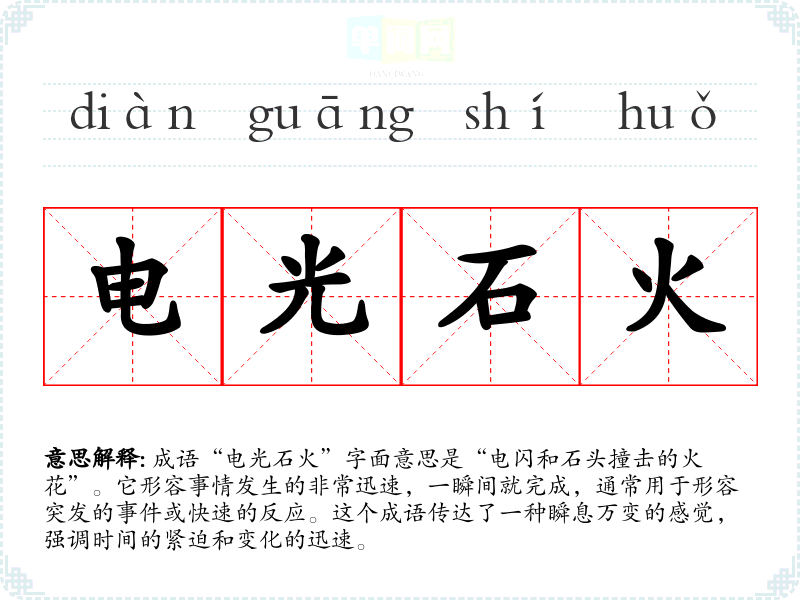 | 电光石火 | 闪电的光,燧石的火。原为佛家语,比喻事物瞬息即逝。现多形容事物象闪电和石火一样一瞬间就消逝。 |