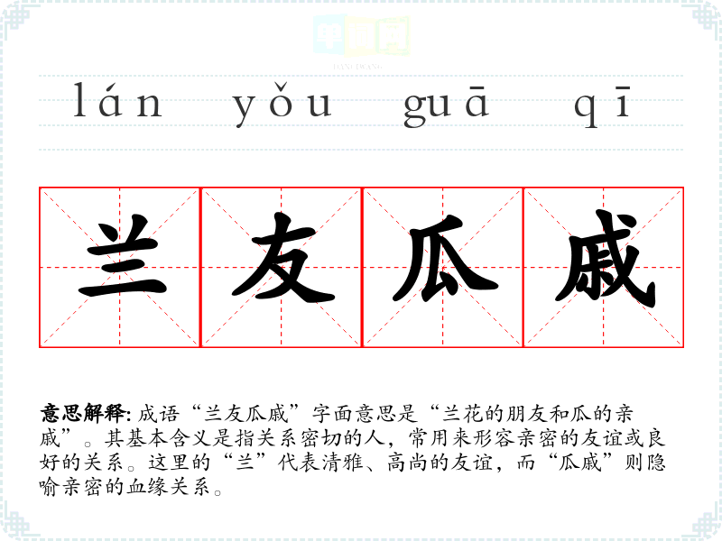 成语“兰友瓜戚”字面意思是“兰花的朋友和瓜的亲戚”。其基本含义是指关系密切的人,常用来形容亲密的友谊或良好的关系。这里的“兰”代表清雅、高尚的友谊,而“瓜戚”则隐喻亲密的血缘关系。