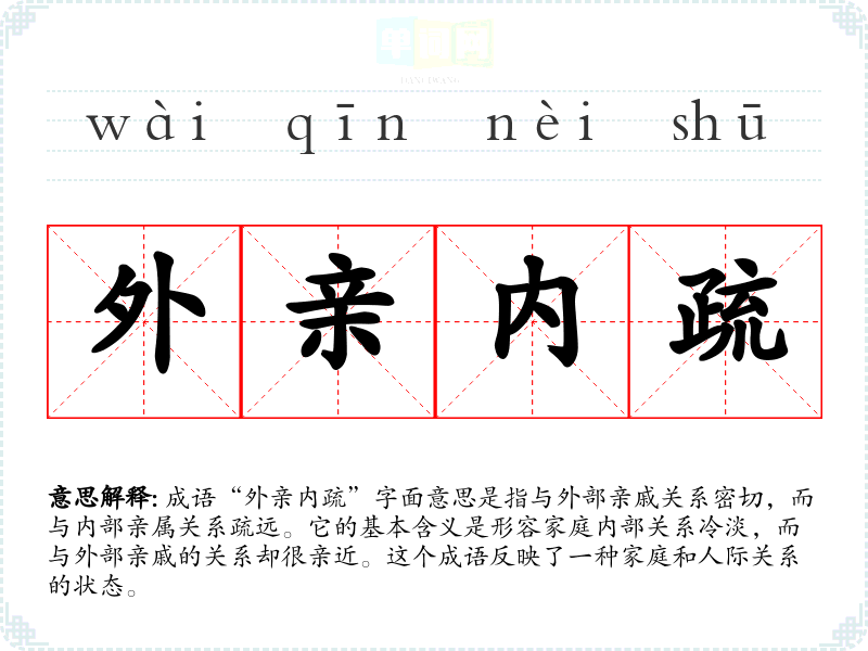成语“外亲内疏”字面意思是指与外部亲戚关系密切,而与内部亲属关系疏远。它的基本含义是形容家庭内部关系冷淡,而与外部亲戚的关系却很亲近。这个成语反映了一种家庭和人际关系的状态。