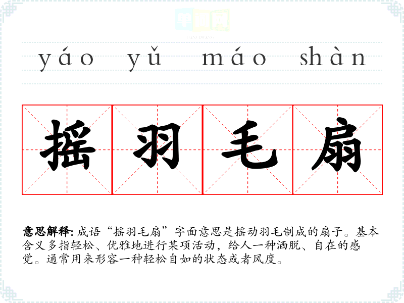“摇羽毛扇”并没有特定的历史背景或经典典故,它的构成元素(羽毛、扇子)常用于古代文人雅士的生活场景中。羽毛扇常常是文人墨客在文人聚会、游玩时使用的器物,象征着清雅与从容。因此,该成语可以视为对古代文人气质的描绘。
