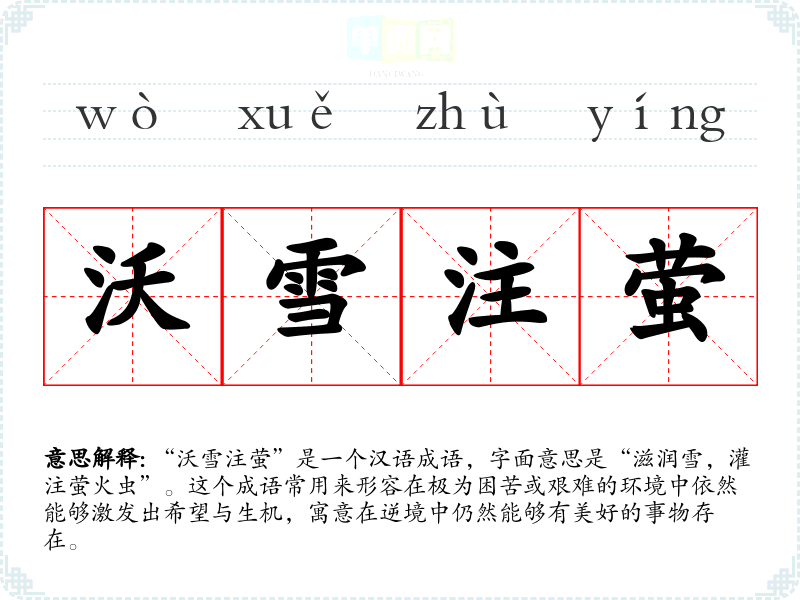 “沃雪注萤”是一个汉语成语,字面意思是“滋润雪,灌注萤火虫”。这个成语常用来形容在极为困苦或艰难的环境中依然能够激发出希望与生机,寓意在逆境中仍然能够有美好的事物存在。