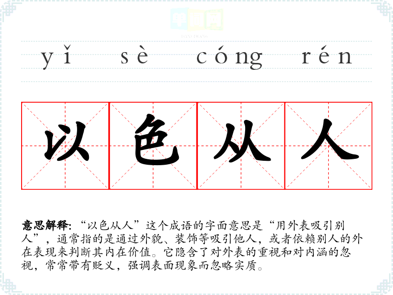 “以色从人”这个成语的字面意思是“用外表吸引别人”,通常指的是通过外貌、装饰等吸引他人,或者依赖别人的外在表现来判断其内在价值。它隐含了对外表的重视和对内涵的忽视,常常带有贬义,强调表面现象而忽略实质。