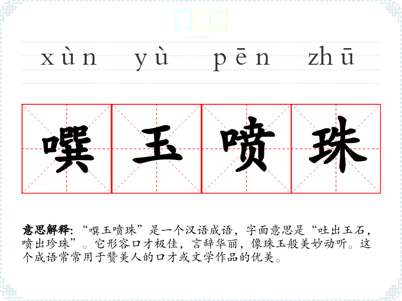 “噀玉喷珠”是一个汉语成语,字面意思是“吐出玉石,喷出珍珠”。它形容口才极佳,言辞华丽,像珠玉般美妙动听。这个成语常常用于赞美人的口才或文学作品的优美。