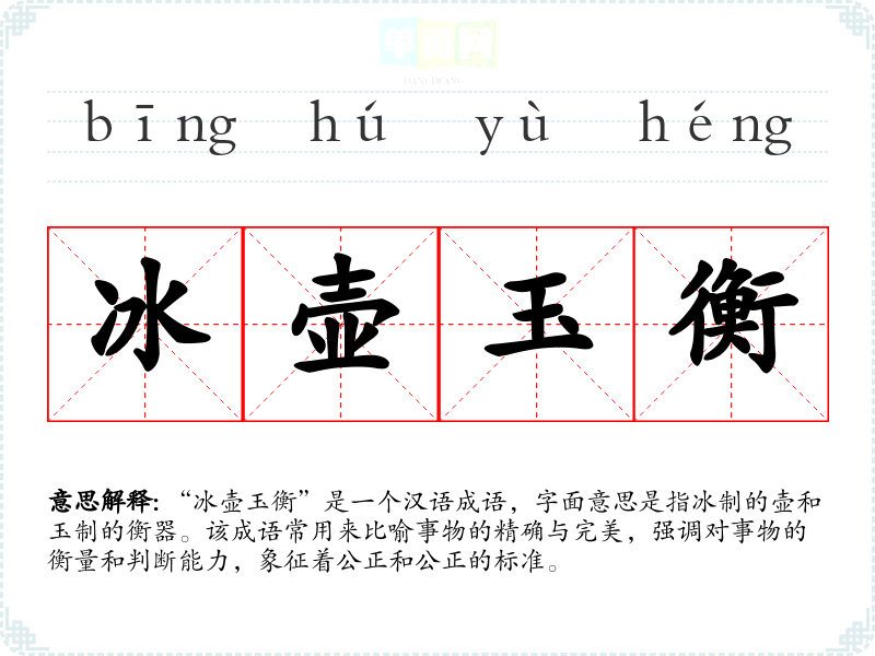 “冰壶玉衡”出自《汉书·王莽传》。成语中的“冰壶”与“玉衡”分别代表了“冰”和“玉”的完美与精致,体现了古人对事物的追求与理想,强调了其在科学、判断及平衡方面的重要性。