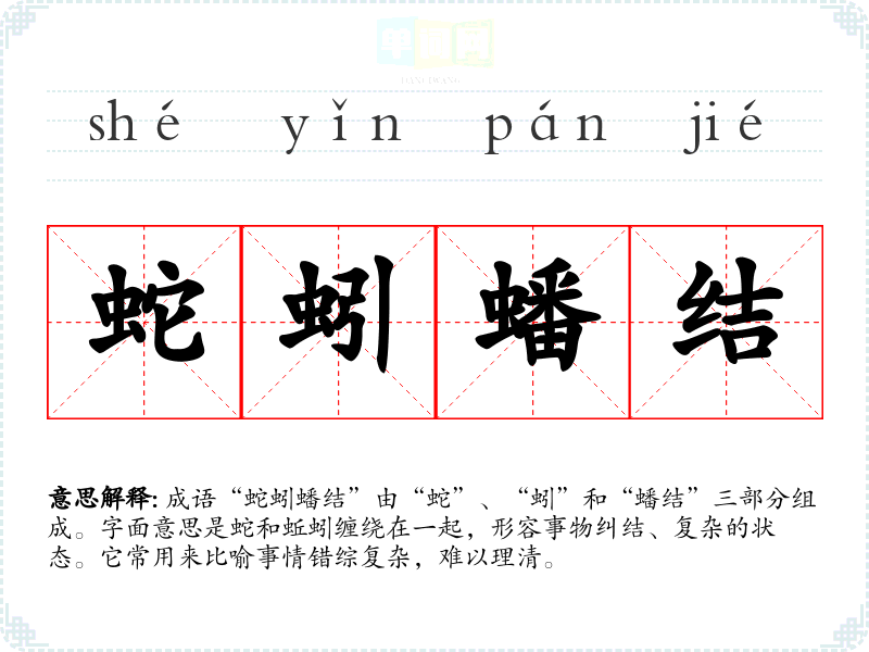 成语“蛇蚓蟠结”由“蛇”、“蚓”和“蟠结”三部分组成。字面意思是蛇和蚯蚓缠绕在一起,形容事物纠结、复杂的状态。它常用来比喻事情错综复杂,难以理清。