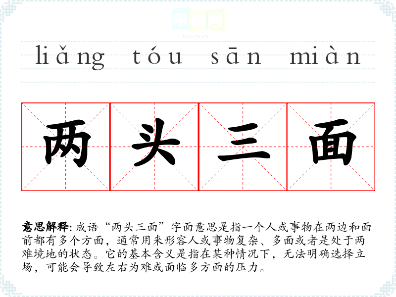 成语“两头三面”字面意思是指一个人或事物在两边和面前都有多个方面,通常用来形容人或事物复杂、多面或者是处于两难境地的状态。它的基本含义是指在某种情况下,无法明确选择立场,可能会导致左右为难或面临多方面的压力。