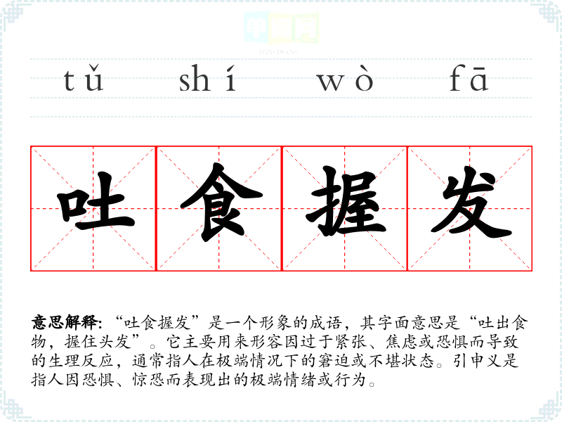 “吐食握发”是一个形象的成语,其字面意思是“吐出食物,握住头发”。它主要用来形容因过于紧张、焦虑或恐惧而导致的生理反应,通常指人在极端情况下的窘迫或不堪状态。引申义是指人因恐惧、惊恐而表现出的极端情绪或行为。