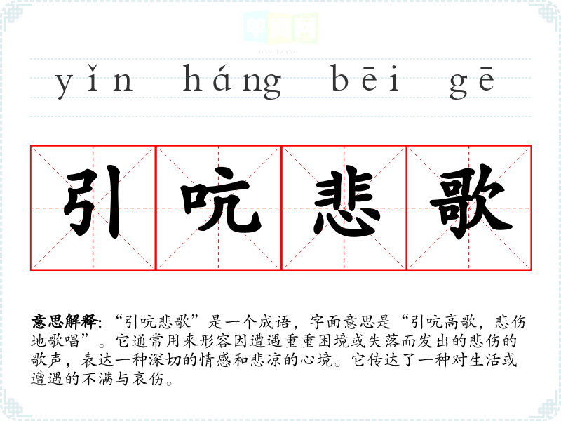 “引吭悲歌”是一个成语,字面意思是“引吭高歌,悲伤地歌唱”。它通常用来形容因遭遇重重困境或失落而发出的悲伤的歌声,表达一种深切的情感和悲凉的心境。它传达了一种对生活或遭遇的不满与哀伤。