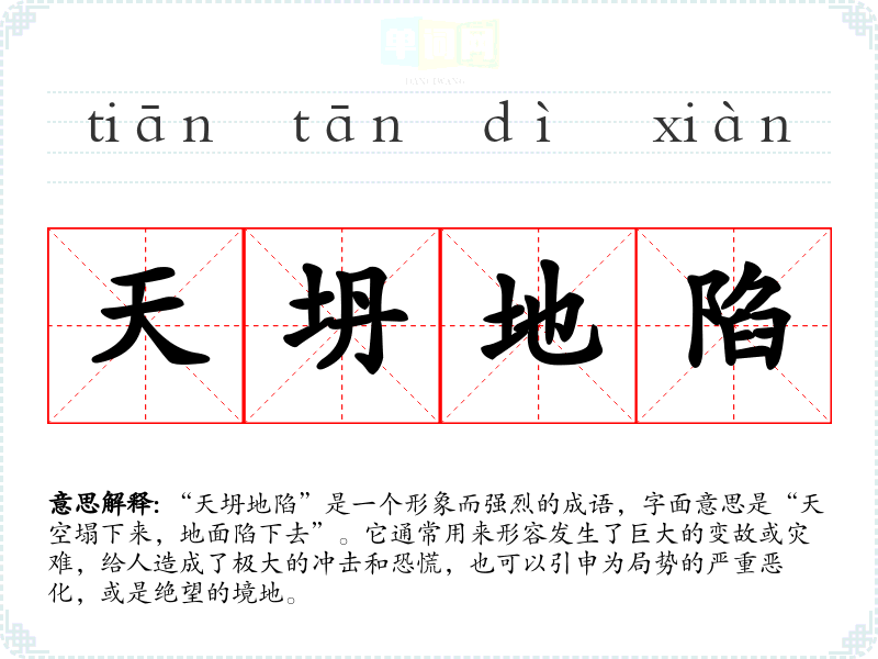 “天坍地陷”是一个形象而强烈的成语,字面意思是“天空塌下来,地面陷下去”。它通常用来形容发生了巨大的变故或灾难,给人造成了极大的冲击和恐慌,也可以引申为局势的严重恶化,或是绝望的境地。