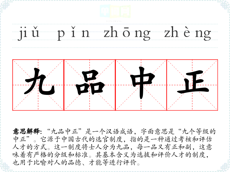 “九品中正”是一个汉语成语,字面意思是“九个等级的中正”。它源于**古代的选官制度,指的是一种通过考核和评估人才的方式。这一制度将士人分为九品,每一品又有正和副,这意味着有严格的分级和标准。其基本含义为选拔和评价人才的制度,也用于比喻对人的品德、才能等进行评价。