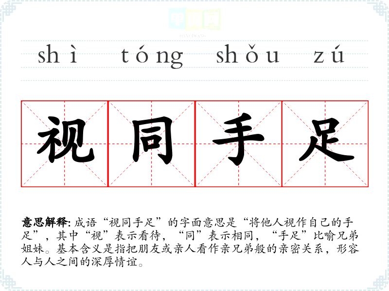 成语“视同手足”的字面意思是“将他人视作自己的手足”,其中“视”表示看待,“同”表示相同,“手足”比喻兄弟姐妹。基本含义是指把朋友或亲人看作亲兄弟般的亲密关系,形容人与人之间的深厚情谊。